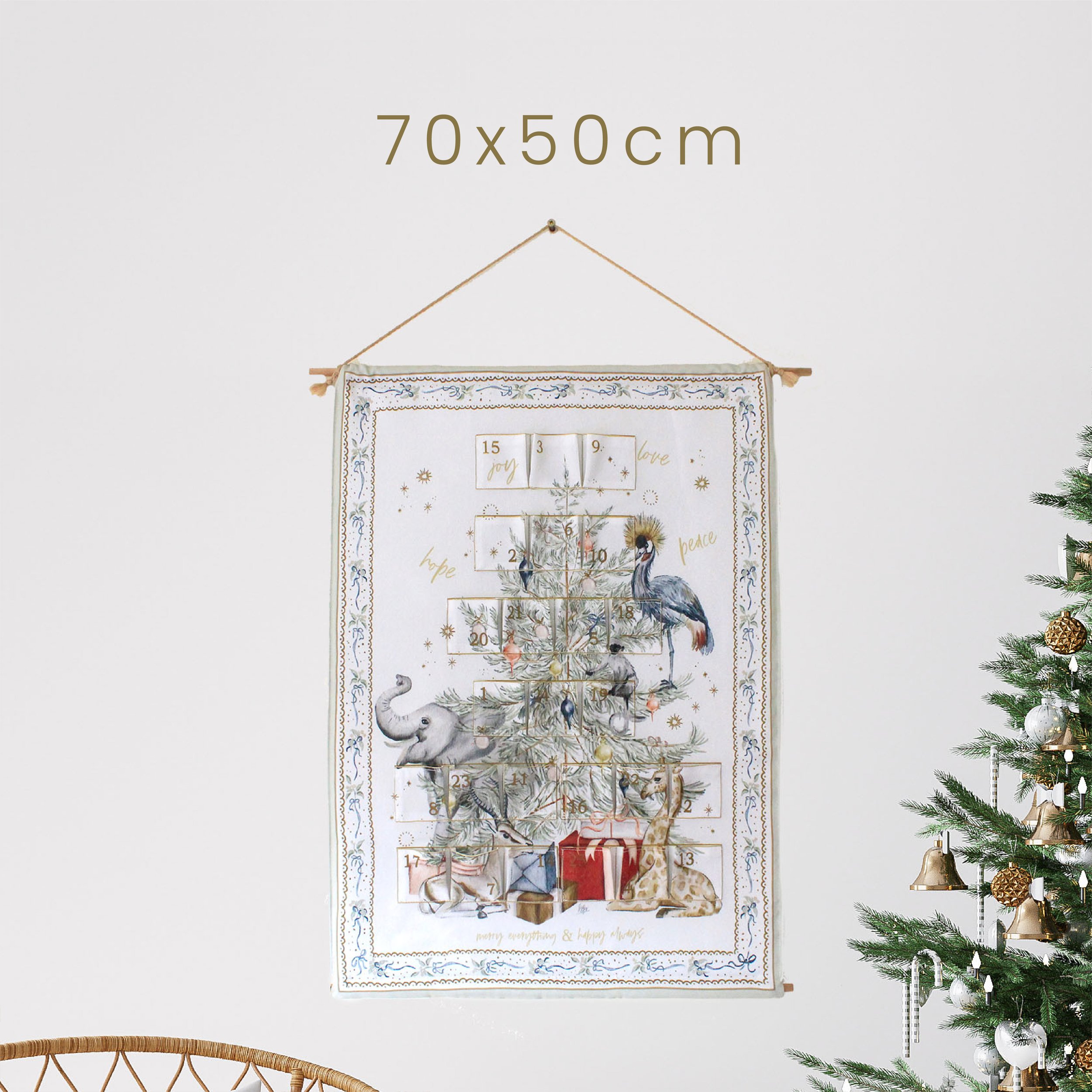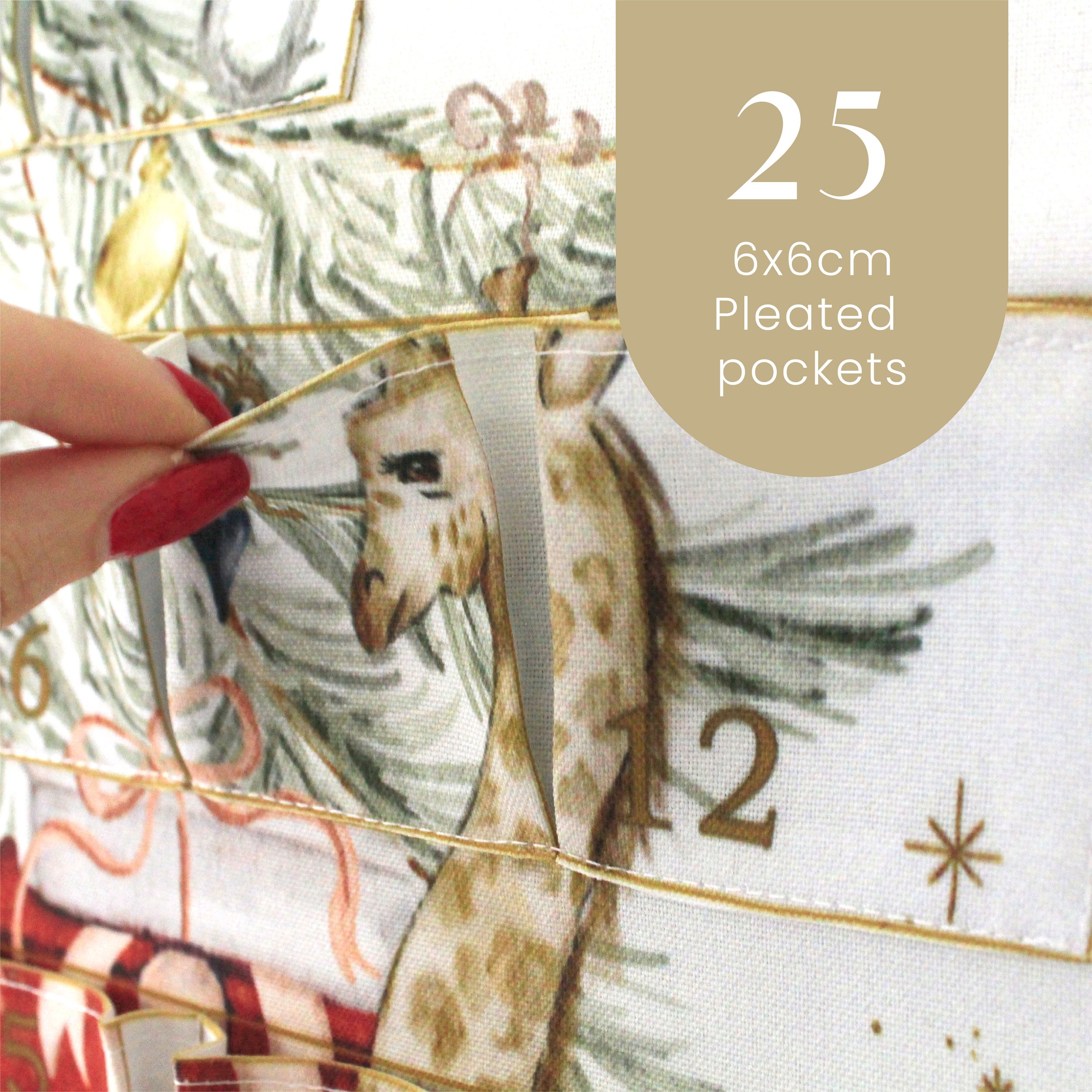 Designed to be cherished year after year, our fabric advent calendar is more than a countdown to Christmas—it’s a tradition in the making. Featuring 25 generously sized pockets, each adorned with a delicate pleat, you can fill them with tiny treasures, sweet treats, or heartfelt notes. Watch as the joy unfolds each day, bringing your family closer to the magic of the season.